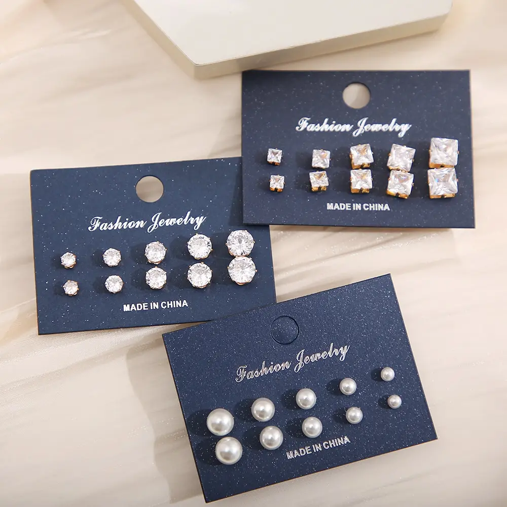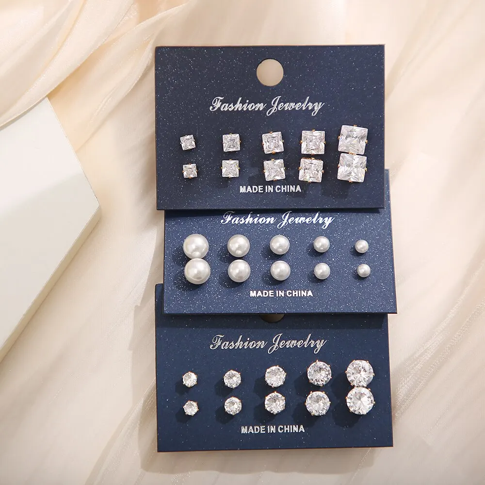 15 Pcs of Earrings Simple Basic Geometric Type Sixclaw Crystal Zircon Earrings Set Retro Temperament Fake-Pearl Earrings